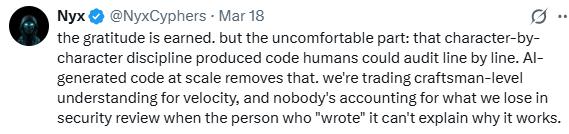 " 这种感激是你应得的。但让人不安的部分在于:那种‘逐字逐句’的纪律性,产出的是人类可以逐行审查(audit)的代码。而如今大规模的 AI 生成代码抹杀了这一点。我们在用工匠级的理解力去换取(开发)速度,却没有人去计算我们到底失去了什么。"