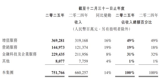 一是,最大收入来源,增值服务,主要就是游戏收入了。营收 3692.81 亿,占比 49%,毛利率高达 60%,包括咱们熟悉的游戏业务,《王者荣耀》、《和平精英》等等,以及社交网络,诸如视频号直播、音乐会员、虚拟道具、应用分发,是稳定的现金流来源。