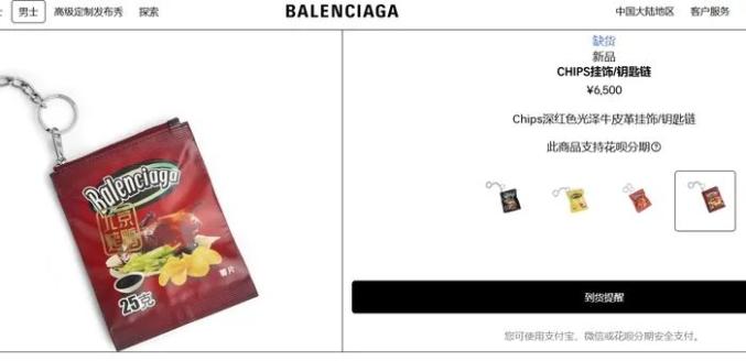 去年6月,巴黎世家就推出了一款“北京烤鸭”包袋。该包外形与零食袋相似,呈长方形。包身正面印有一只烤鸭图案,还有“Balenciaga”“北京烤鸭”的字样,背面印有“营养成分”表,封口处有细长条拉链。该包的专柜售价为15500元。