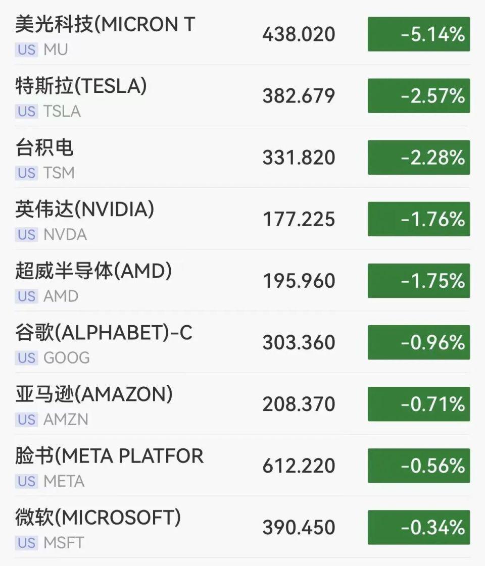 其中,科技巨头、芯片股集体下挫,费城半导体指数开盘跌超 3%,目前跌幅收窄至 1.2%。个股方面,美光科技跌超 5%,特斯拉跌超 2.5%,英伟达跌超 1.7%。
