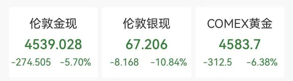 贵金属股全线大跌,New Pacific Metals、Endeavour Silver 跌超 13%,First Majestic Silver 跌超 11%,泛美白银、科尔黛伦矿业跌超 10%,埃氏金业、金罗斯矿业、纽曼矿业跌超 9%,哈莫尼黄金跌超 8%。消息面上,今晚黄金白银跳水幅度还在扩大,现货黄金跌超 5%,报 4539 美元 / 盎司。现货白银日内跌幅超 10%,报 67.2 美元 / 盎司。(详见)