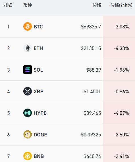 加密货币主要币种下跌,其中比特币跌超 3%,跌破 7 万美元关口,过去 24 小时,全市场超 14 万人爆仓。