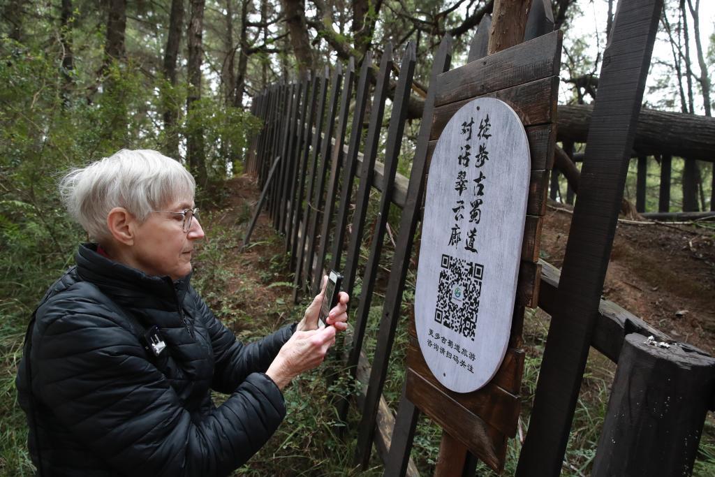 3 月 15 日,贾和普在广元市剑阁县古蜀道用手机扫描铭牌上的二维码。新华社发 刘仁 摄