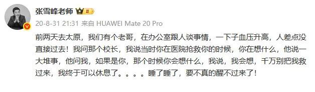 2020 年,张雪峰说:前两天去太原,我们有个老哥,在办公室跟人谈事情,一下子血压升高,人差点没直接过去!我问那个校长,我说当时你在医院抢救你的时候,你在想什么,他说一大堆事,他问我,如果是你,那个时候你会想什么,我说,我会想,千万别把我救过来,我终于可以休息了。。。。睡了睡了,要不真的醒不过来了!