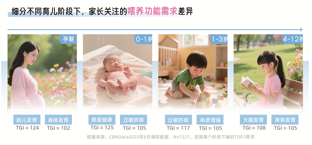 纵向上,不同育儿阶段下,家长关注的喂养重点不同,“分龄精养”成为新一代父母的育儿共识。家长对母婴产品的选择已从过去的“通用型”转向以生理发育阶段为轴心的“精准匹配”。在0-1岁阶段,喂养过程中肠道健康与过敏防御是家长关注的重心;进入1至3岁后,除过敏问题外,体质增强成为新焦点;而当孩子步入4至12岁的学龄期,大脑发育与身体成长则成为核心关注维度。