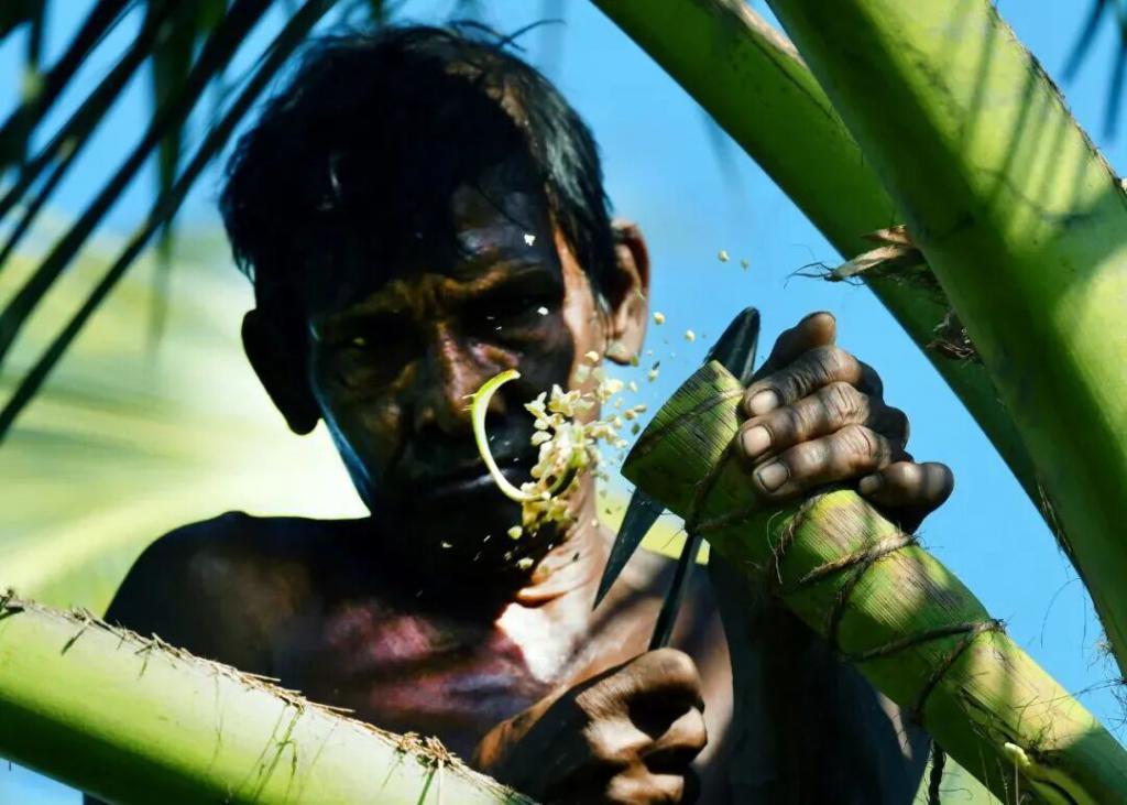 一名工人用刀砍断椰子树的枝叶采集树汁 / 新华社发(阿吉特 · 佩雷拉摄)