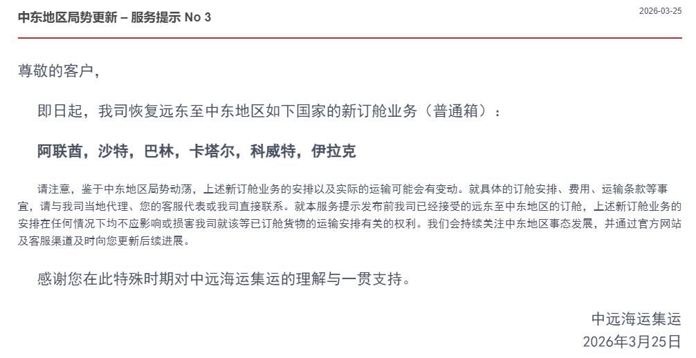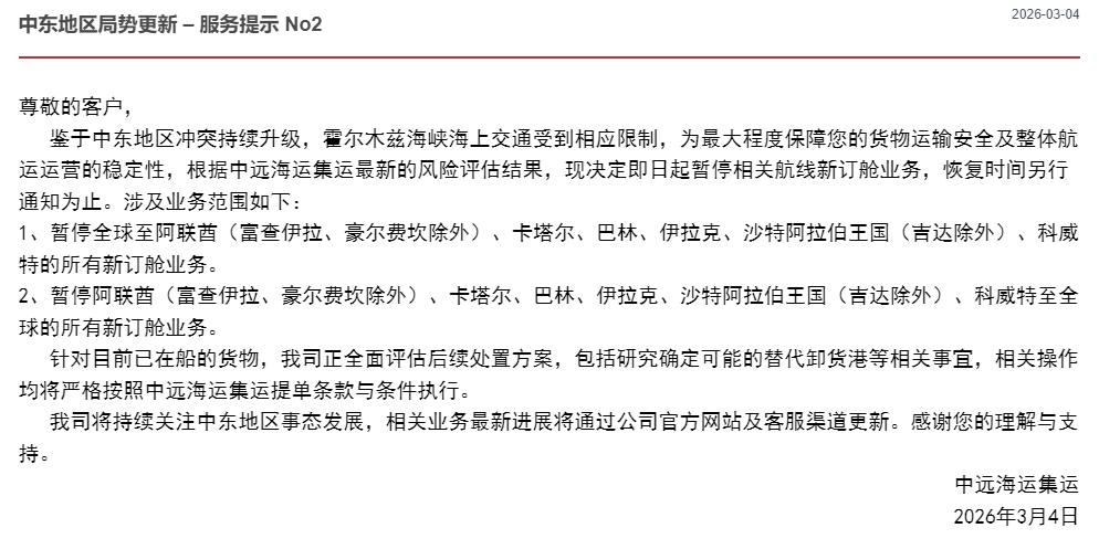 此前,中远海运集运在 3 月 4 日曾发布服务提示称:鉴于中东地区冲突持续升级,霍尔木兹海峡海上交通受到相应限制,为最大程度保障您的货物运输安全及整体航运运营的稳定性,根据中远海运集运最新的风险评估结果,现决定即日起暂停相关航线新订舱业务,恢复时间另行通知为止。