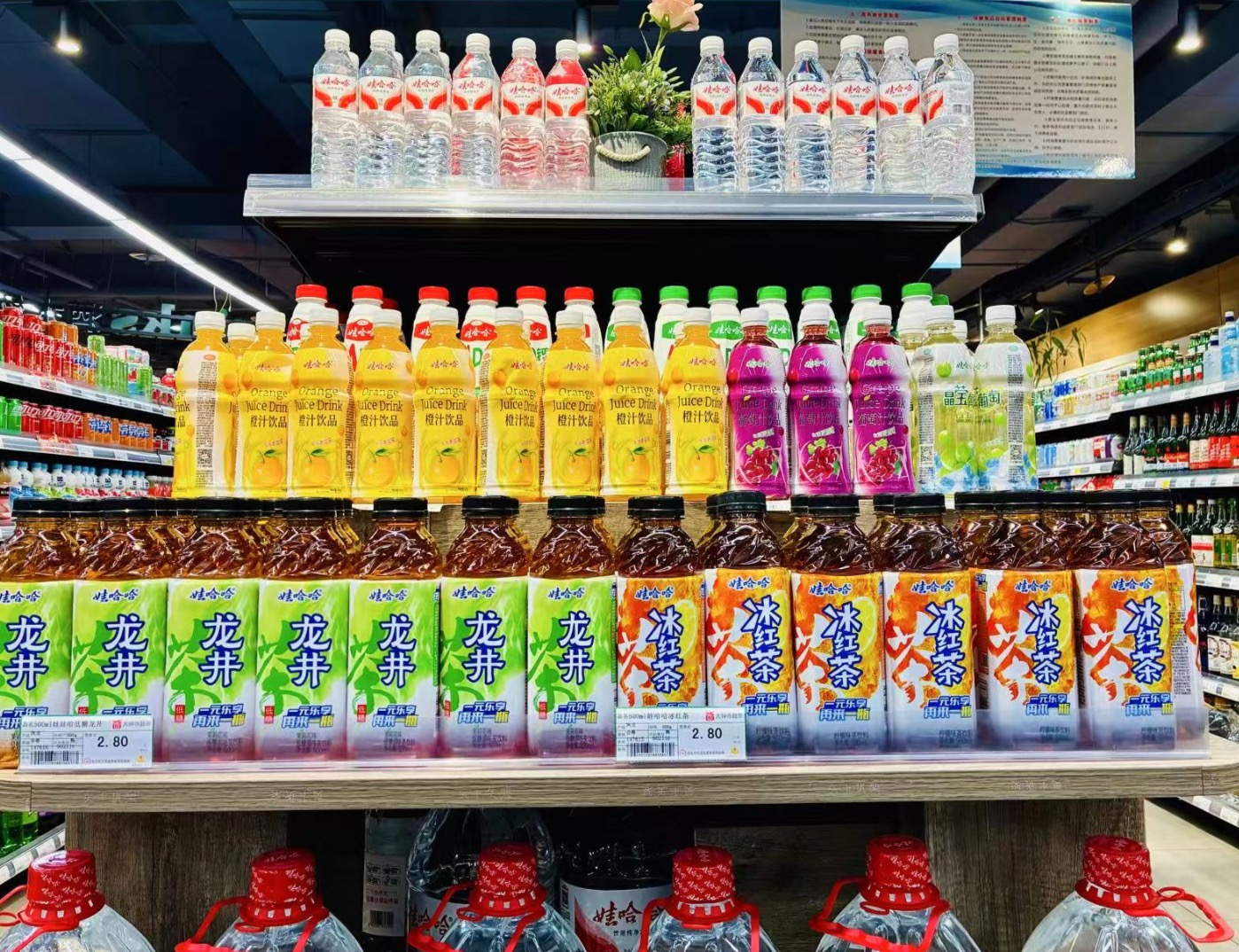 今年3月,界面新闻走访北京、河北超市看到,娃哈哈的包装水、龙井茶、冰红茶等产品铺货充足,其中冰红茶和龙井茶产品还有“一元再享一瓶”的活动。