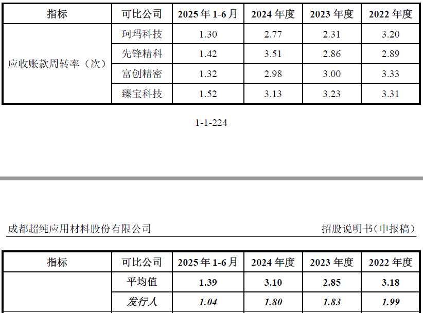 但增长背后,成都超纯的应收账款周转率持续走低:2022年为1.99次/年,2023年降至1.83次/年,2024年为1.8次/年,2025年上半年为1.04次/年,不足2022年的六成。同时,公司应收账款周转率始终低于可比公司的平均水平。