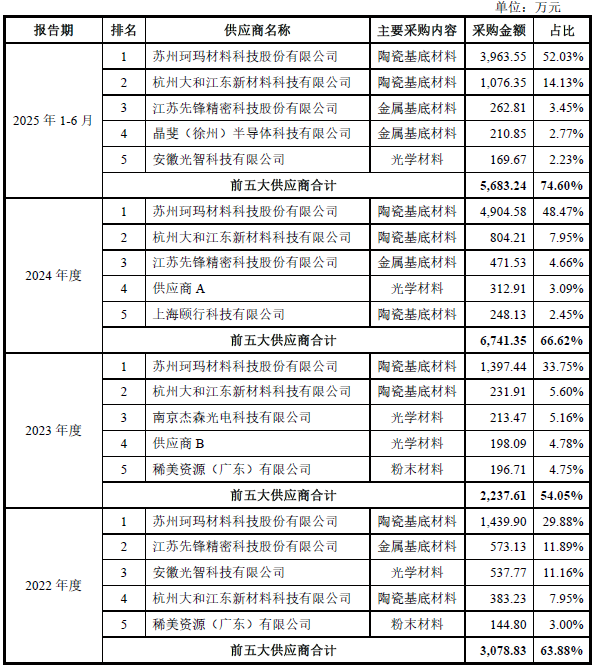 报告期内,成都超纯对珂玛科技的采购占比持续攀升:2022年为29.88%,2023年增至33.75%,2024年大幅上升至48.47%,2025年上半年进一步突破52.03%。与此同时,公司前五大供应商的采购占比也从2022年的63.88%升至2025年上半年的74.60%,供应商集中度持续提升,供应链多样性严重不足。