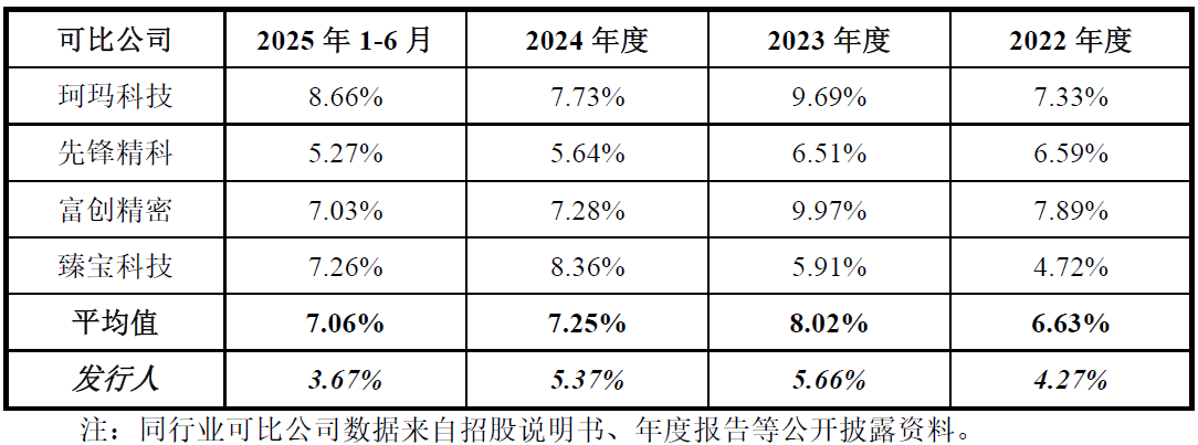 财务数据显示,2023年成都超纯研发费用率为5.66%,2024年下滑至5.37%,2025年上半年,公司研发费用率进一步下滑至3.67%。同期,同行业可比公司的研发费用率平均值在7%以上。