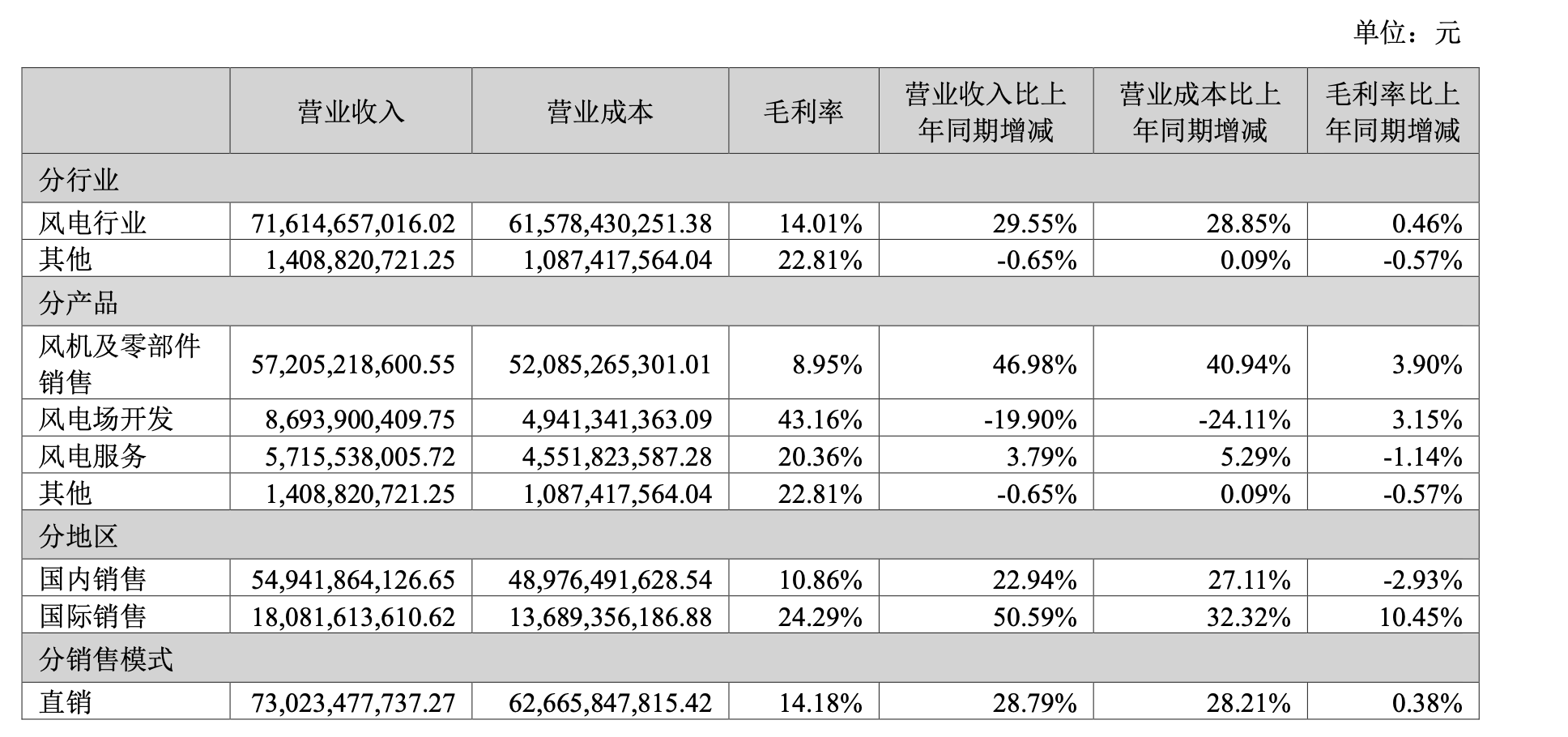 但风电场仍是金风科技毛利率最高的业务,达到43.16%,同比增长3.15个百分点。同期,金风科技实现风电服务收入57.16亿元,毛利率20.36%。这两部分业务毛利率均高于风机制造的8.95%。
