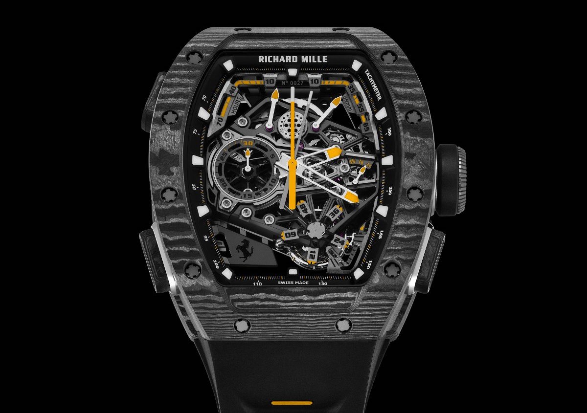 这款新作融合了制表领域最复杂的两项高级复杂功能:陀飞轮及计时码表——以双秒针设计精准记录分段时间,其机械架构与赛车世界更是紧密相连。在设计上,RM 43-01腕表将多层次的视觉与机械元素巧妙融合,同时承袭法拉利赛道基因与工程哲学。设计重点之一是加强机芯的三维立体感,以多种工艺及细节呈现法拉利发动机缸体与曲轴箱的复杂几何结构。