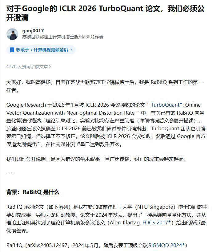 高健扬指出,谷歌回避了 TurboQuant 算法与 2024 年他在新加坡南洋理工大学(NTU)读博期间发布的 RaBitQ 方法的相似性,并错误描述了 RaBitQ 的理论结果,还刻意营造不公的实验环境。