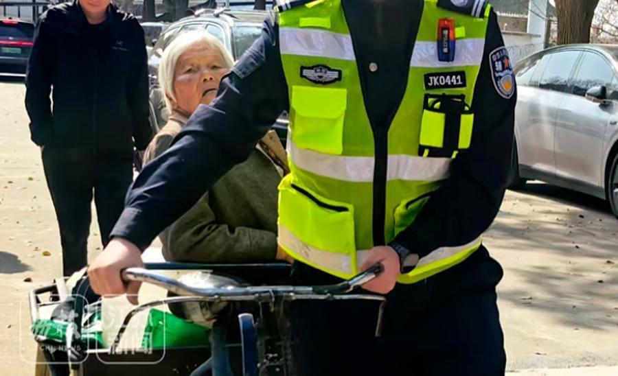 3 月 28 日 10 时许,在常州经开区横山桥福寿庵附近路段,正在清明祭扫安保执勤的辅警胡文崔,发现一位白发老奶奶正推着小三轮艰难前行。老奶奶佝偻着背,步履蹒跚,三轮车里放着几包祭品,显然是到山上的墓园祭拜的。" 这里距离最近的墓园还有一公里,上山的路开始爬升,老奶奶显然体力不支,推着三轮车走得格外吃力。" 胡文崔立即上前询问,得知老奶奶今年已有 90 多岁高龄,此行是专程前来祭拜离世十余年的老伴。