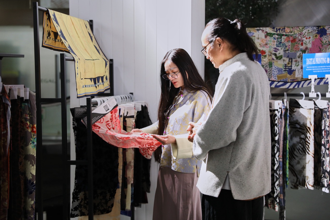 一层的非遗匠人市集聚集了盘扣、刺绣、珠宝等手工品牌,制作过程直接对外展示;二层中庭被改造成“面料图书馆”,不同材质被陈列、触摸与对比,消费者可以在现场完成从选料到理解工艺的第一步;再往上,品牌定制展售区则提供更完整的定制服务,从款式选择到量体沟通都可以当场完成。