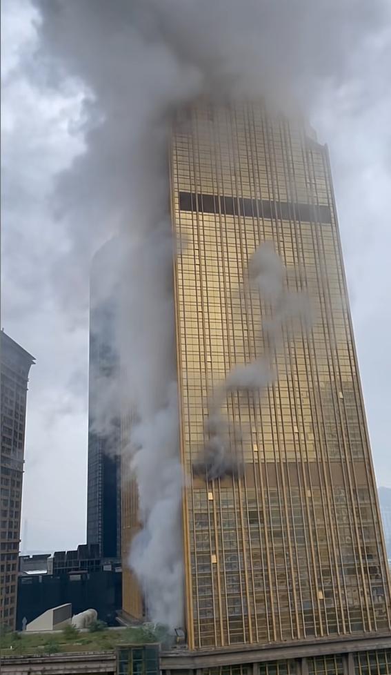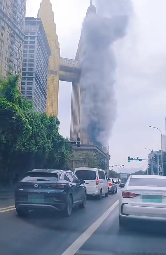 视频里,是一栋金色外立面的大楼,浓烟滚滚。能听见消防车疾驰的声音。
