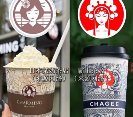 有网友指出,日本品牌 CHARMING 的 logo 将霸王茶姬标志性的京剧脸谱女性直接替换为和服女性形象,人物构图、线条轮廓、配色方案几乎完全一致。