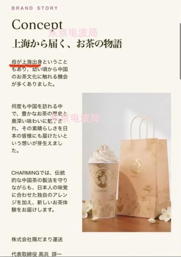 据日本品牌 CHARMING 官方介绍,该店创始人因母亲为上海人,深受中国茶文化熏陶。品牌承诺,在坚守传统中国茶制法的同时,将针对日本人口味进行改良。