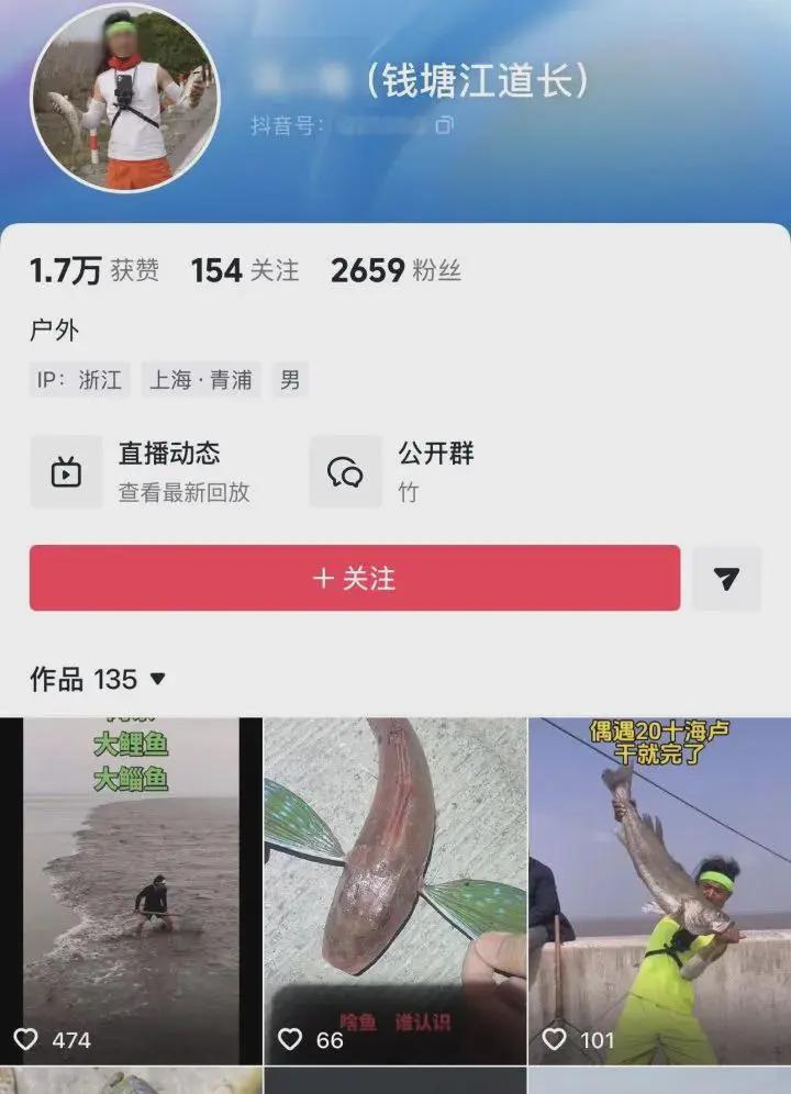 记者注意到," 钱塘江道长 " 的社交账号,有 2719 个粉丝,总共 1.8 万点赞。主页视频,大多数是他在钱塘江里扛着大网兜追逐潮头鱼。