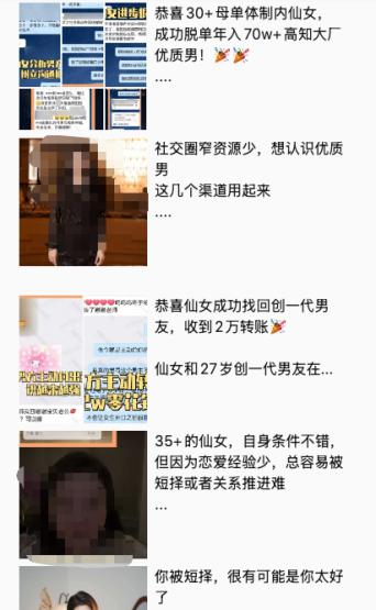 例如,教一位 24 岁的北京女博士如何与年薪 200 万元的 40 岁男性推进婚姻关系;帮一位 26 岁的上海女生结识 40 岁的离异科技公司高管;或是帮助一位中年女性挽回已经断联的前男友。截图里往往包括学员的聊天记录、转账记录、感谢信。这些内容被频繁展示,用来证明她的方法 " 有效 "。