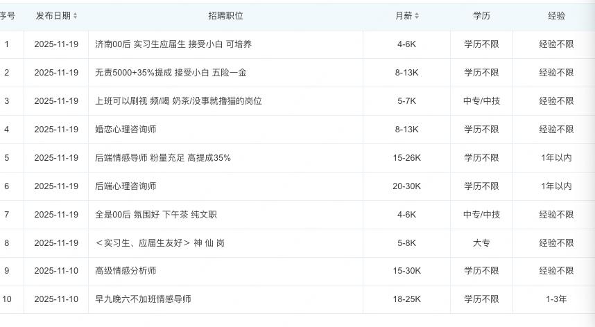 这类公司的用人门槛也不高。部分机构对 " 情感咨询师 " 的学历要求仅为中专及以下,只要经过几周到几个月不等的培训,就可以上岗接单。