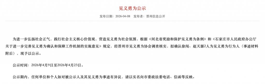4 月 8 日晚,河北晋州市政府官网发布《见义勇为公示》,为进一步弘扬社会正气,践行社会主义核心价值观,营造见义勇为社会氛围,根据《河北省奖励和保护见义勇为条例》和《石家庄市人民政府办公厅关于进一步完善见义勇为确认和保障工作机制的实施意见》规定,经晋州市见义勇为协会调查核实,拟确认徐闯、赵天源 2 人为见义勇为行为人(事迹材料附后),现予以公示:
