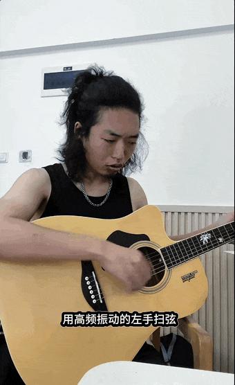 可当他把左手放在琴弦上抖动,画风就变了。眼前的场景与其说在扫弦,更像是木吉他漏电了。