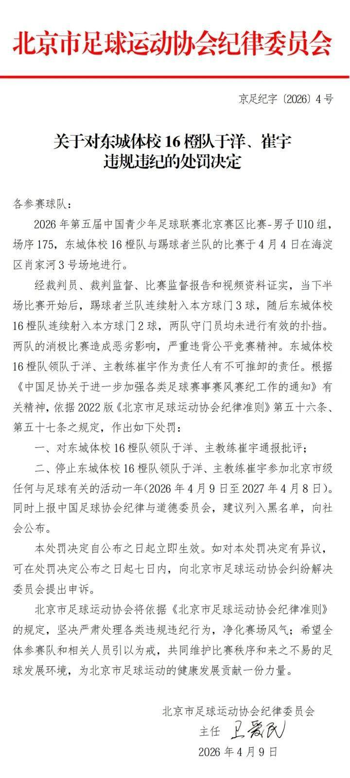 北京时间 4 月 9 日,北京足协连发四条处罚决定,对中青赛北京赛区 U10 组东城体校 16 橙队和踢球者兰队在比赛中互射本方球门的行为处以取消赛事资格,两队领队及主教练均被禁赛一年。