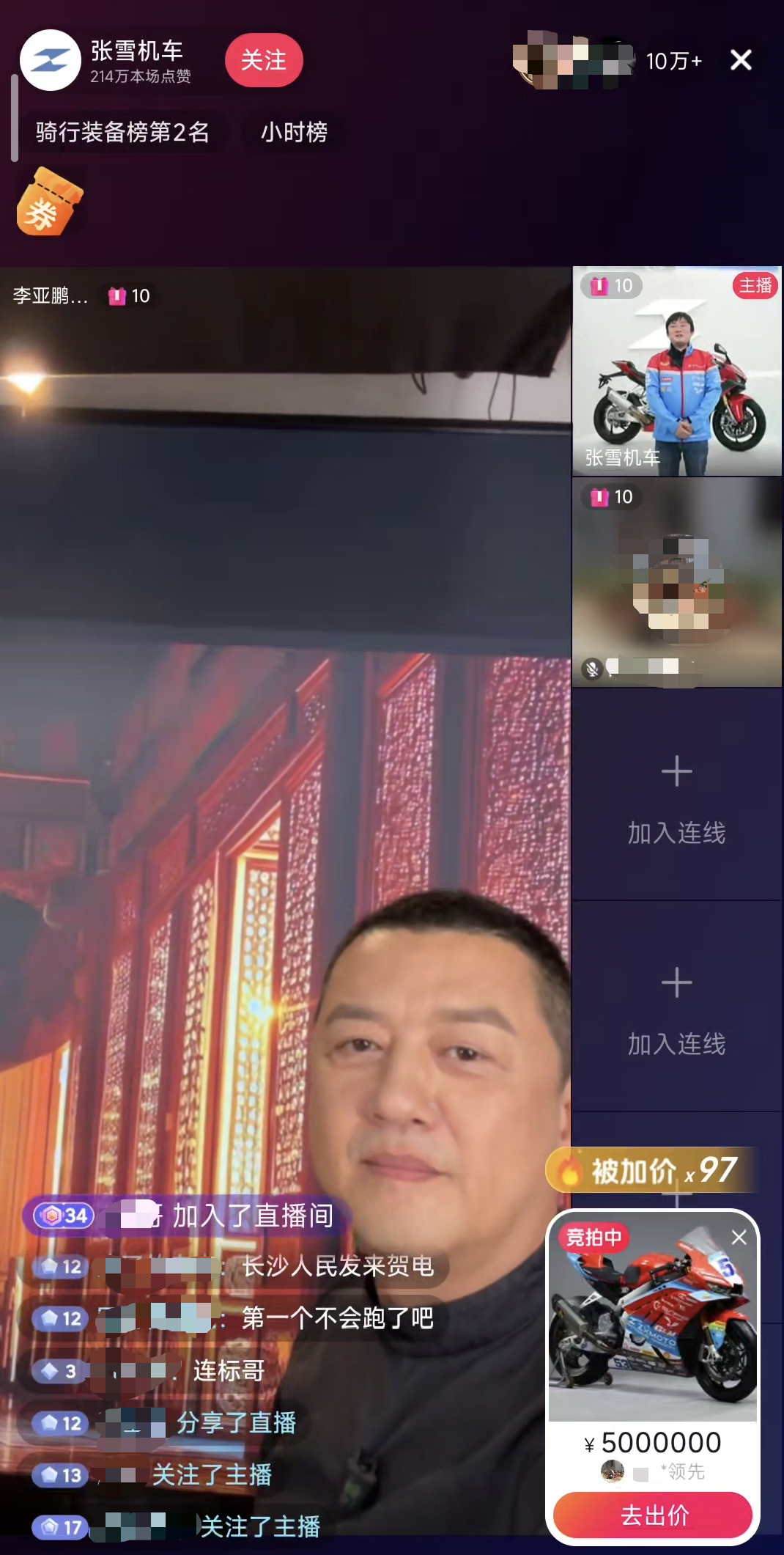 410日晚上8点,中国摩托车品牌张雪机车创始人张雪在其直播间拍卖WSBK夺冠车820复刻车赛车,并为拍卖设置了封顶价500万元。按照拍卖规则,竞拍者不能一次性出价500万,只有出价100万以上后一直点,先触达500万者得,有一定运气成分。