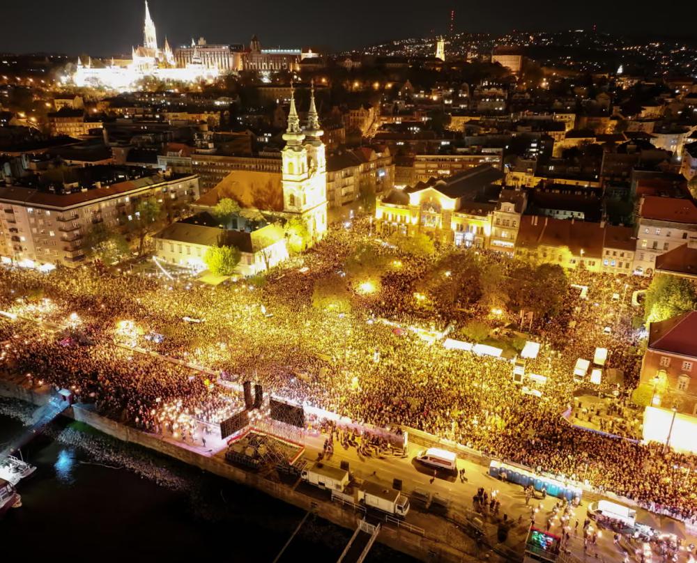 3 天后,在匈牙利首都布达佩斯横跨多瑙河的大桥上,几万名欧尔班支持者浩荡前行,将选举视为决定命运的 " 十字路口 ";而在英雄广场,至少 10 万名毛焦尔的支持者挥舞旗帜,怒斥政府用宣传手段撕裂了国家。一城双面,匈牙利的社会情绪已绷紧到极点。