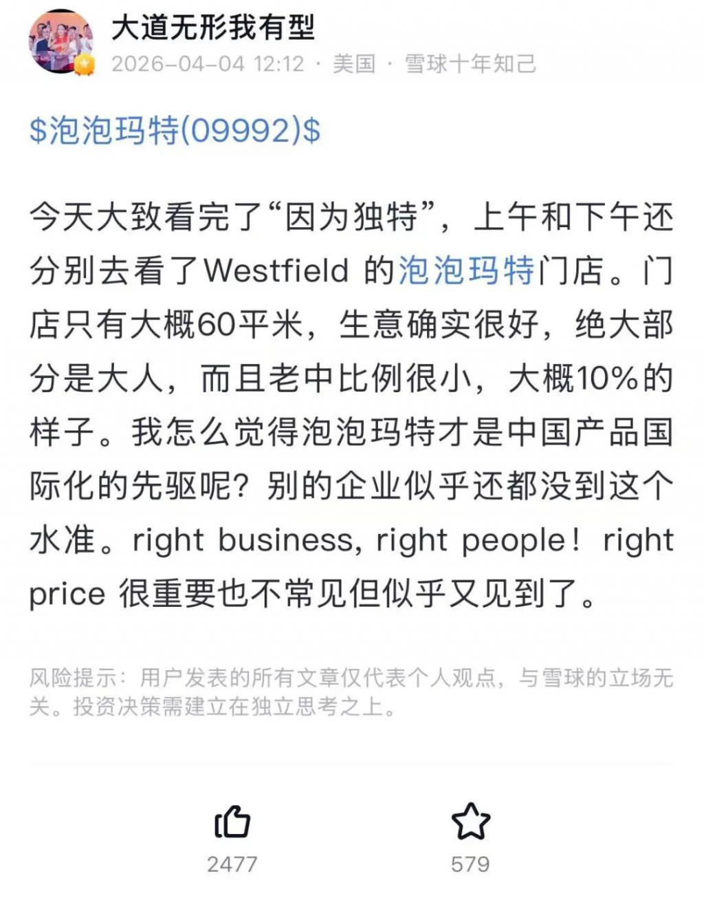 4 月 9 日,段永平还发文表示:泡泡玛特的壁垒目前看上去有几个(排名不分先后,还没想清楚重要性的排序):已经建立起来的用户关注度(品牌),艺术家的签约壁垒,全球各地的门店,强大的王宁和他的 team(包括生产,物流,品质以及一切及其他)。这些壁垒不能保证潮玩可以一直有人喜欢,但可以让喜欢潮玩的人们一直关注泡泡玛特的。泡泡玛特的壁垒远比想象中强大,只要潮玩会有持续性,泡泡玛特就是非常好的生意了。不过,在持续性上的争议会持续很久的,所以他们可能还需要一直证明下去(他们自己其实不需要证明什么,他们只要继续做他们该做的事情就好)。大家可以先看个五年十年吧。