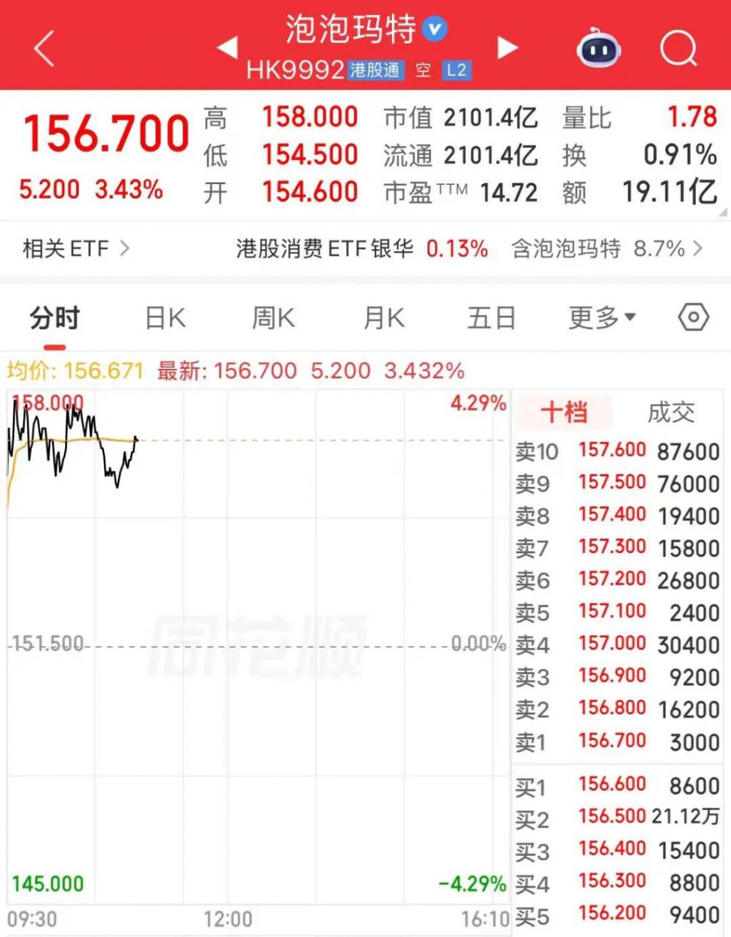 不过,泡泡玛特发布财报后股价发生大跌。自 3 月 25 日至今,公司股价累计跌幅超 26%。截至发稿,泡泡玛特股价为 156.7 港元,上涨 3.43%,市值 2101.4 亿港元。
