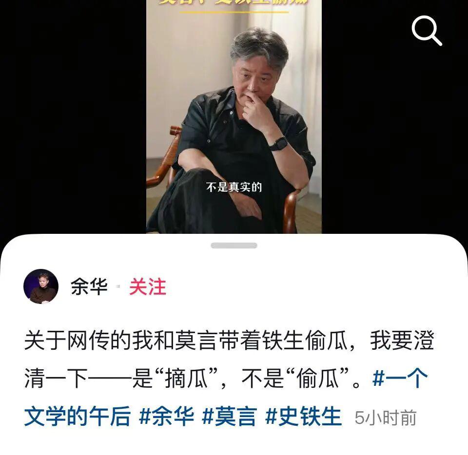 4 月 14 日,余华在个人社交账号发视频辟谣 " 偷瓜 " 事件:当时只是去摘瓜没偷,也没带铁生。