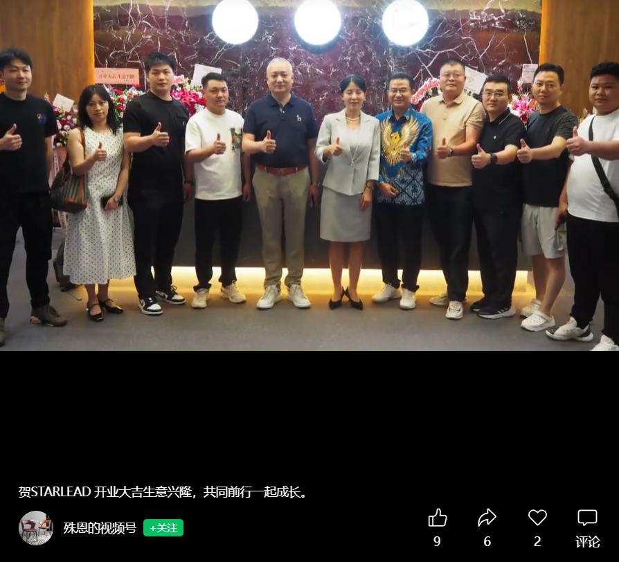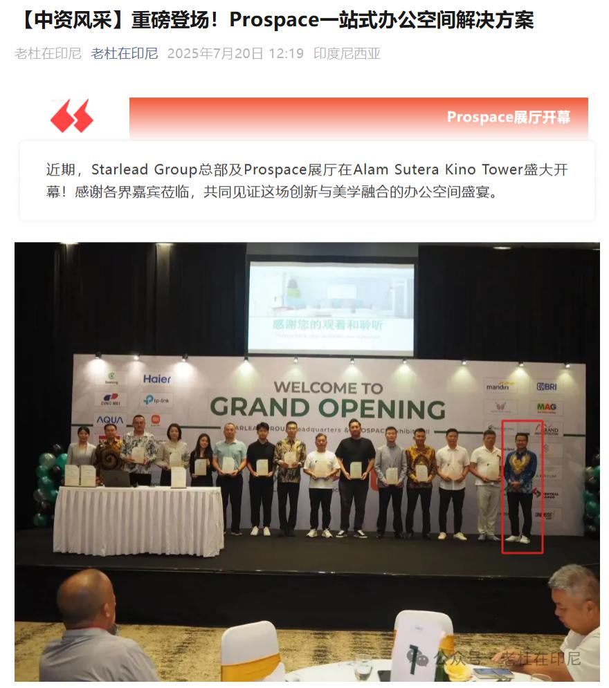 多个印尼相关账号曾在 2025 年 7 月发文,Starlead Group 总部及 Prospace 展厅在 Alam Sutera Kino Tower 开幕,照片最右侧穿蓝色花衣服的疑似为刘立荣。