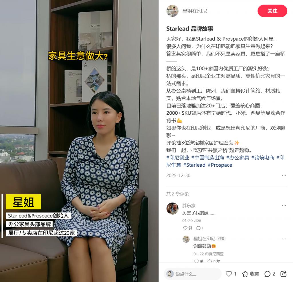 而根据国内的 " 星姐在印尼 " 社交媒体账号分享,Starlead & Prospace 的创始人名叫何星,该公司目前已落地雅加达 20+ 门店,覆盖核心商圈,2000+SKU 背后还有宁德时代、小米、西昊等品牌合作背书。