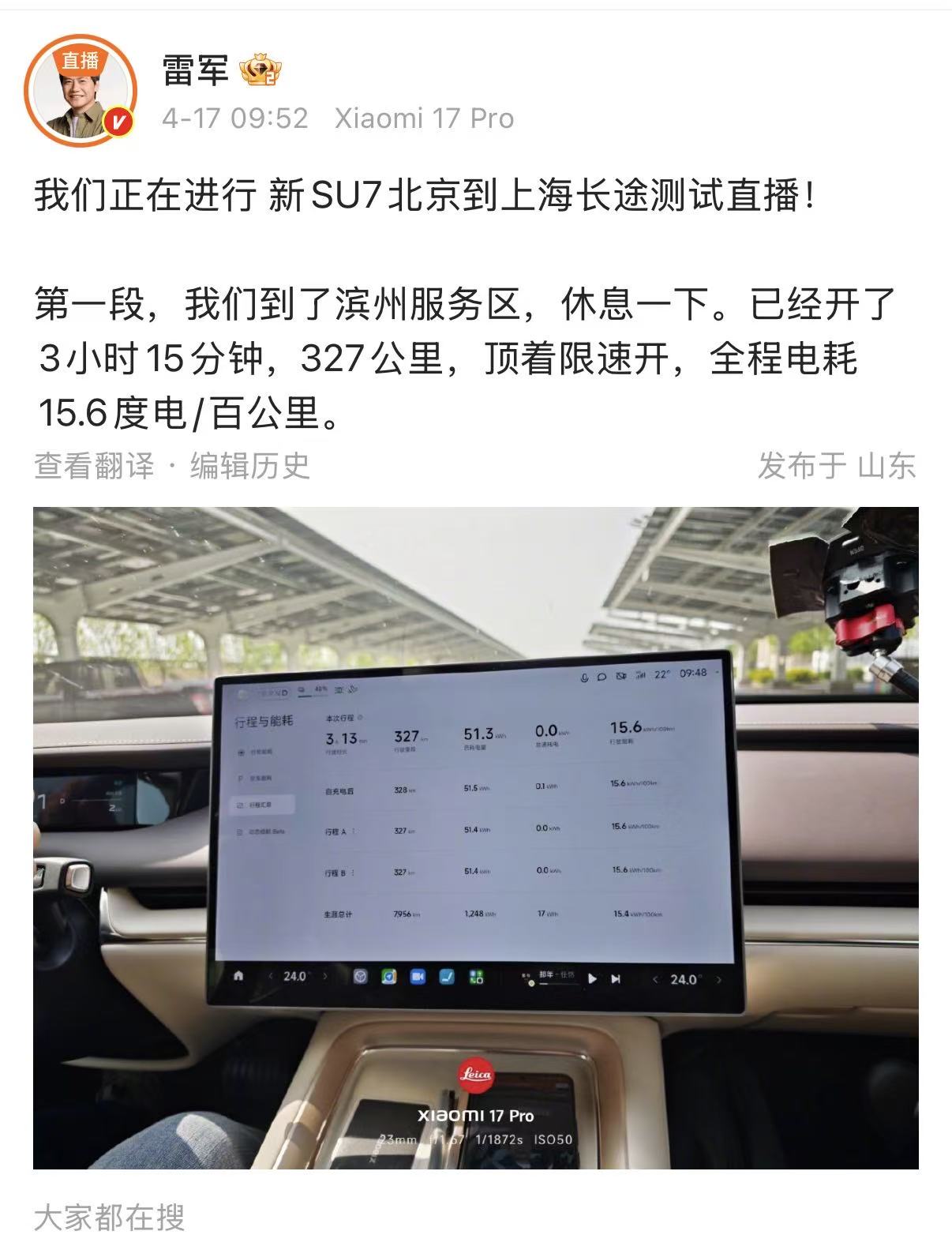上午接近10时,雷军更新一条微博汇报进程:“第一段,我们到了滨州服务区,休息一下。已经开了3小时15分钟,327公里,顶着限速开,全程电耗15.6度电/百公里。”