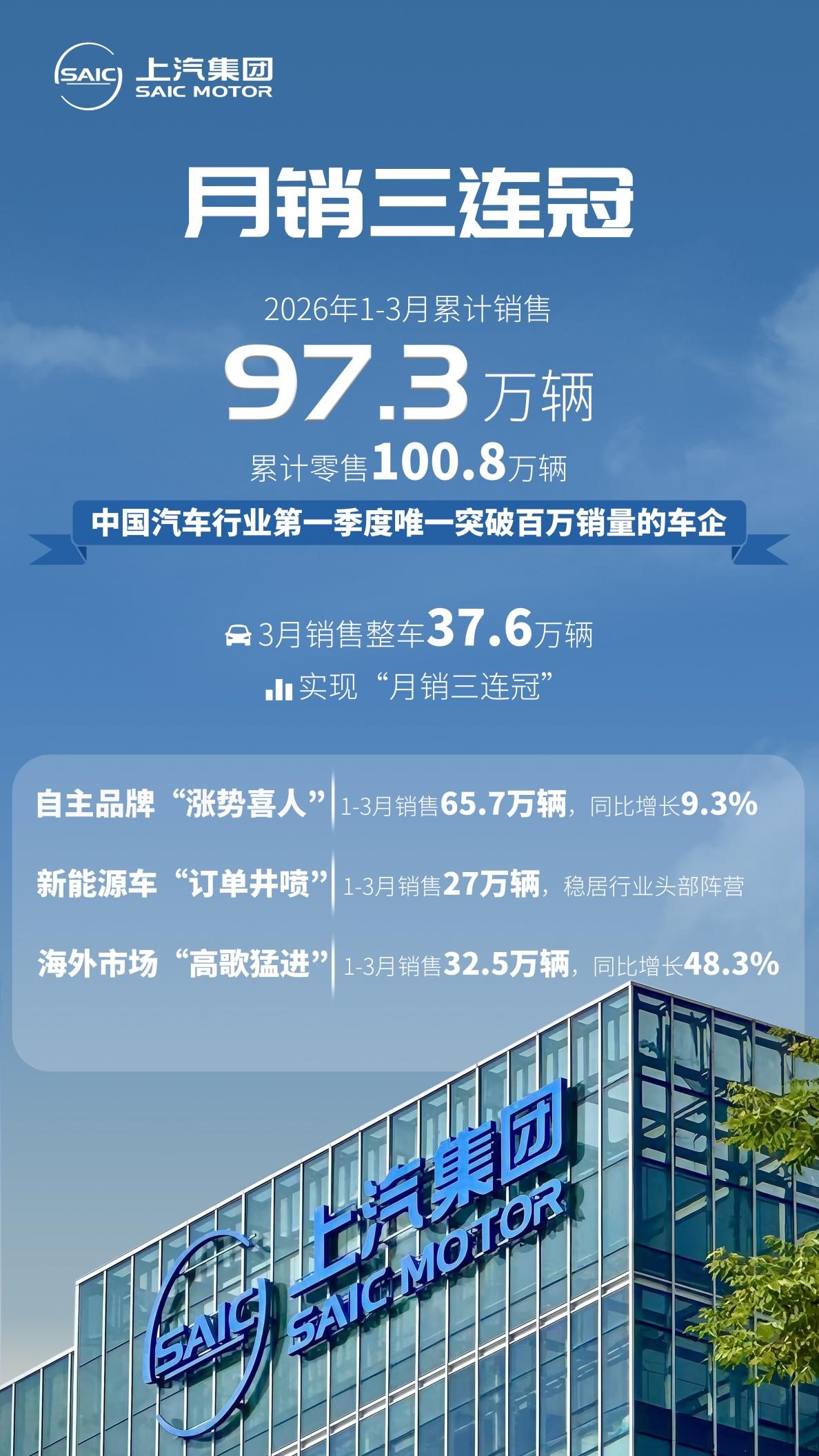 今年3月,上汽集团实现整车销售37.6万辆,成功实现“月销三连冠”;1-3月累计批售97.3万辆,同比增长3%;零售100.8万辆,成为中国汽车行业第一季度唯一突破百万销量的车企。
