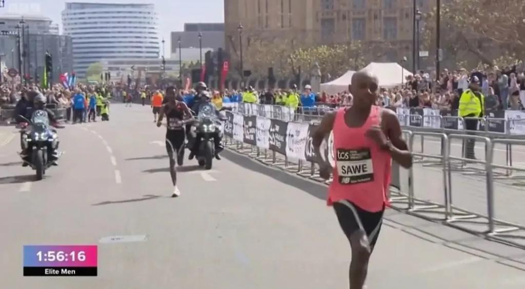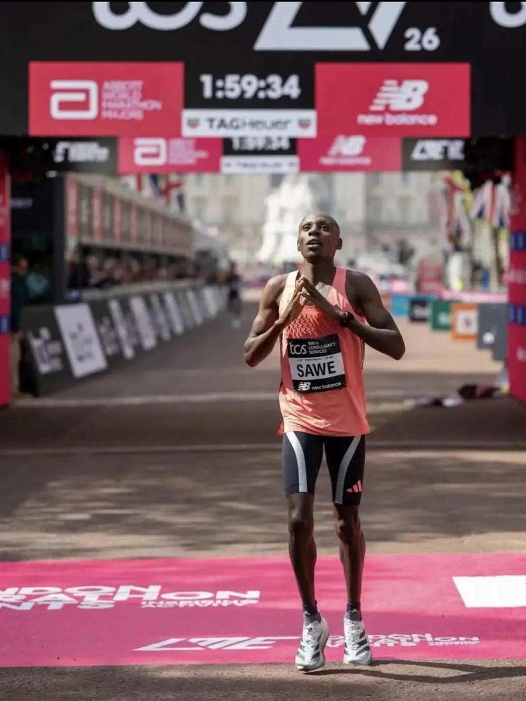 肯尼亚选手萨维(Sabastian Sawe)以 1 小时 59 分 30 秒冲线,成为史上首位在正式比赛中突破两小时大关的人。