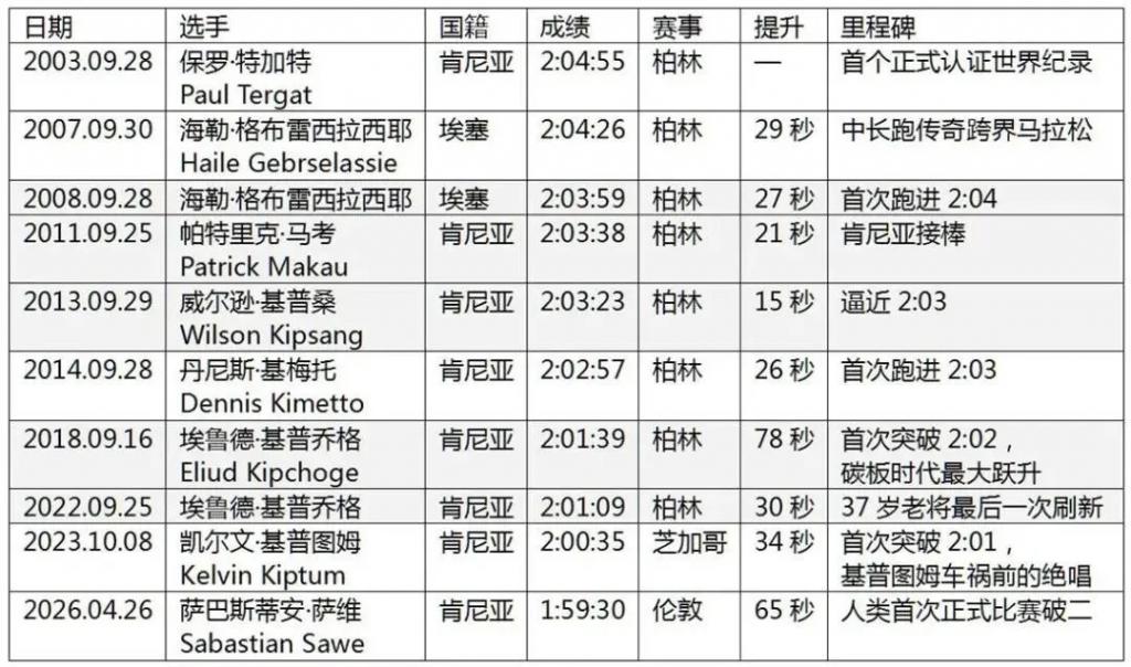 2018 年,传奇老将基普乔格(Eliud Kipchoge)在柏林直接跳到 2 小时 01 分 39 秒,一次砍掉 78 秒,这是整个谱系里最大幅度的单跳。
