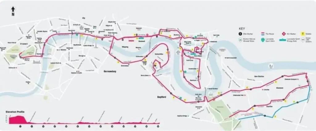 具体数据上,整条 42.2 公里赛道净海拔下降约 35 米——从起点格林威治的布莱克希思(Blackheath,海拔约 54 米)跑到终点白金汉宫旁的林荫道(The Mall,海拔约 19 米)。