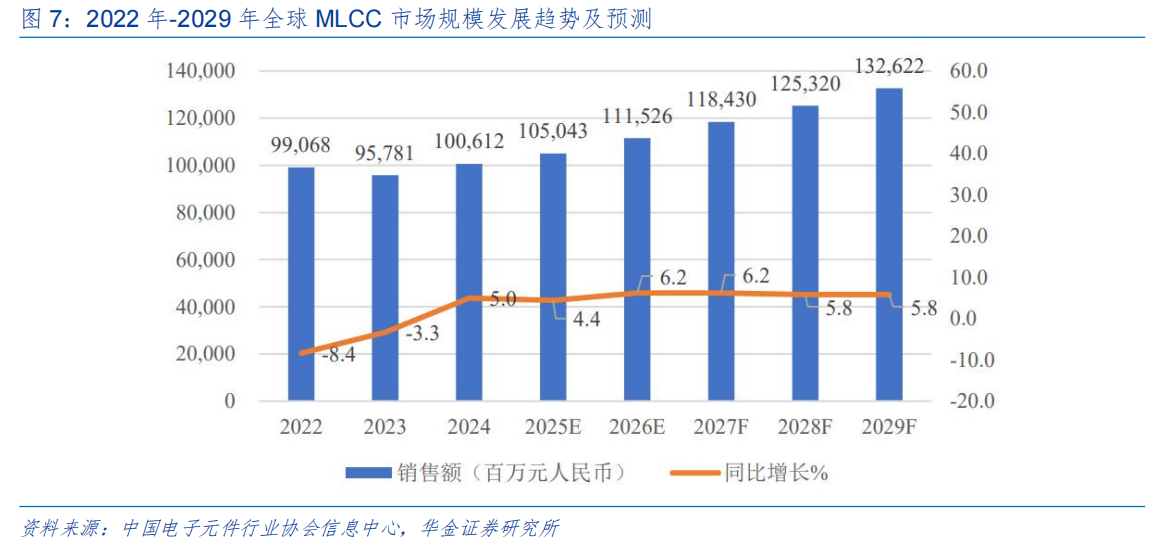 根据中国电子元件行业协会信息中心预测,2025年全球MLCC市场规模约为1050亿元,预计到2029年将达到1326亿元,2024年至2029年复合增长率为5.7%。