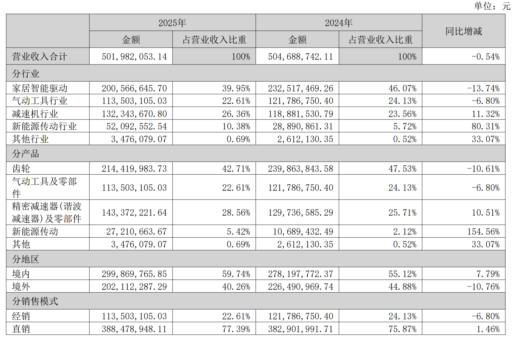 为摆脱传统业务瓶颈,丰立智能近年将战略重心投向两大高景气赛道:新能源汽车传动、机器人精密减速器。从收入数据看,两大方向实现高速增长,成为公司亮眼的结构性亮点,但这也是此次亏损的直接导火索。