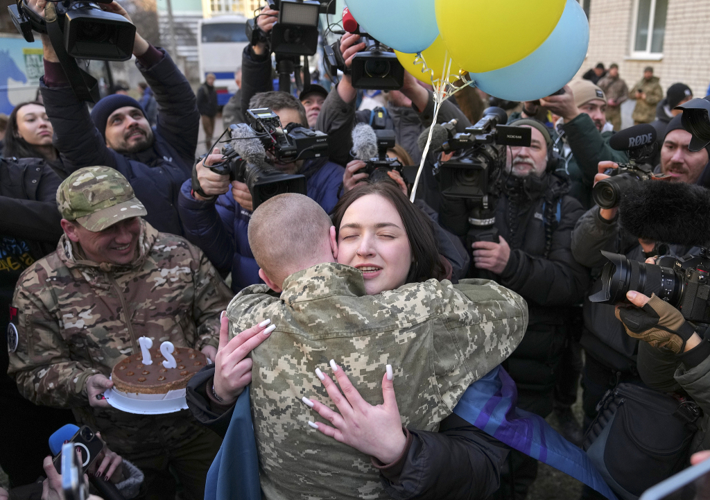 当地时间2025年3月19日,乌克兰切尔尼戈夫地区,乌克兰战俘与亲人团聚。