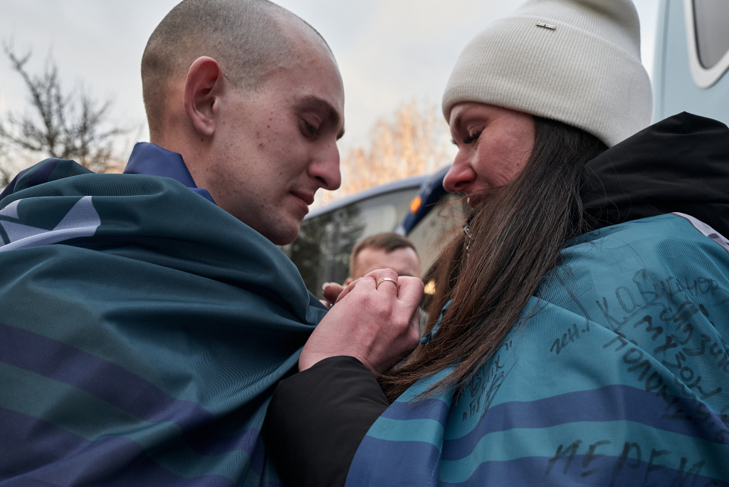 当地时间2025年3月19日,乌克兰切尔尼戈夫地区,乌克兰战俘与迎接自己的妻子相拥。