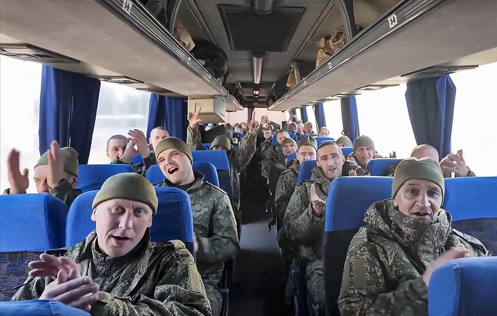 当地时间2025 3月19日,俄罗斯国防部新闻处提供一张视频截屏照片,显示了在白俄罗斯某未公开地点交换的俄罗斯战俘。
