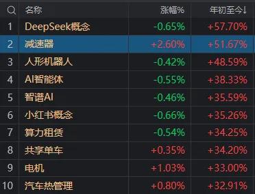 实际上,今天早盘,年内涨幅第一的 DeepSeek 概念,也在 9:51 左右急速拉升发红,一度带动科技股情绪回暖。