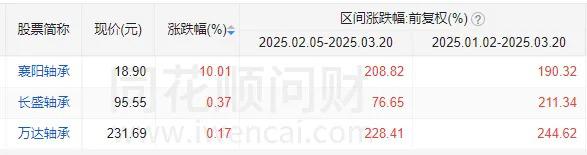 襄阳轴承今天再度涨停,现存的 3 只 " 轴承 " 股,2 月以来都有远超大盘的涨幅。