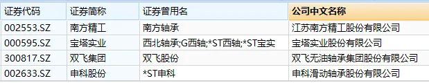 另据梳理,曾用名称为 "xx 轴承 " 的南方精工、宝塔实业,还有公司全名包括轴承二字的双飞集团、申科股份,今天均出现异动。