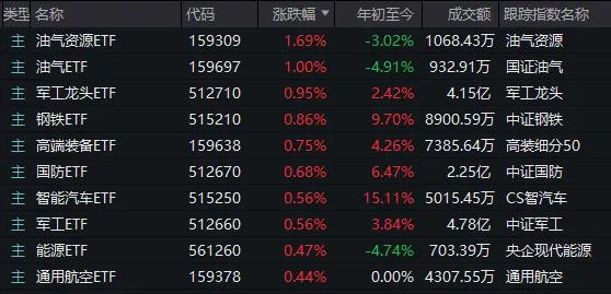 正因如此,主题型产品中,油气资源、高端装备、军工龙头、国防、军工、工业母机等 ETF 纷纷领涨。